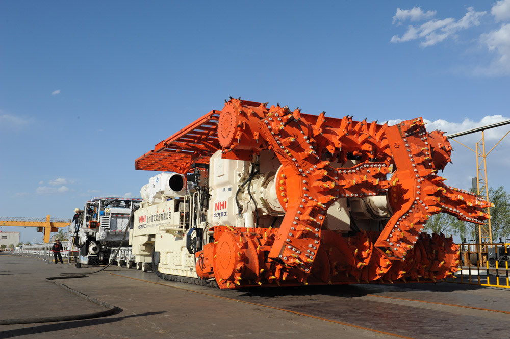 NHI successfully developed the world’s first full-section coal road high efficiency boring machine_QMJ4260.The machine has multifunction of full-section, continuous cutting technology, automatic positioning, wireless remote control technology, fast loading and shipping, dust removing, airborne Roofbolter and shunting . It achieves coal road fast driving, long-distance remote control operation and significantly improves driving efficiency. With over 3000m footage per month, QMJ4260 boring machine achieves another technological leapfrogging in the field of coal driving.